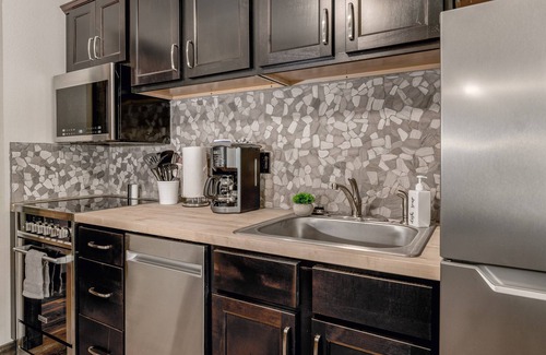 Condo 3: The Dug Out has fun baseball theme and is a studio condo with and an island with stools. There is a queen size bed and a sleeper sofa.