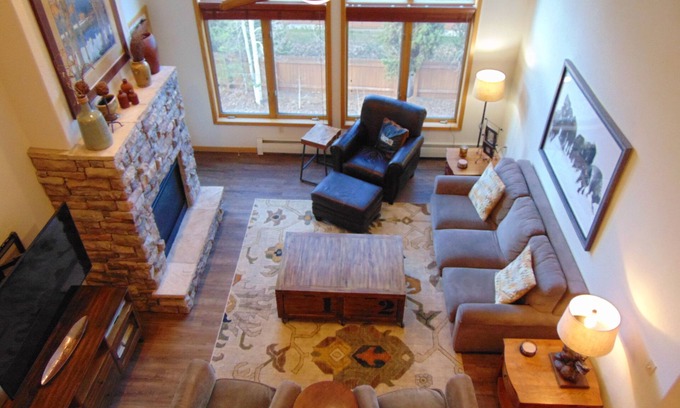 Our unit is stocked with books and games, a Wii, six flat panel televisions, a gas fireplace, and a washer and dryer. On site amenities include a heated pool, hot tub, gas grill, ski lockers, and secured parking. Hop downstairs to visit Breeze ski rental, The Haywood Cafe, and a coffee shop and brewery. If you prefer to ride a free shuttle to the slopes, it stops directly outside our front door.