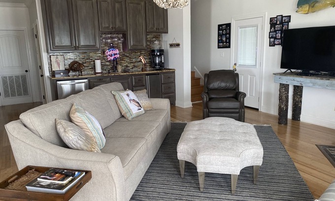 A fishing camp with the comforts of home away from home! Four story camp with an open floor plan, custom cabinetry, granite counters, stainless steel app, Bamboo wood floors, travertine tile, gas fireplace, surround sound, and more...First floor hosts Kitchen/Living/Breakfast/Wet Bar (with drink drawers/ice maker) and Master Suite, Master bedroom is 13½x13½ with private balcony for sunset viewing, master bath has separate toilet room/tiled shower/6' whirlpool tub/surround sound/granite counters. Second level features a junior suite14½x17' with bamboo floors, private bath and balcony , a utility closet with full size washer/drier, 2 other bedrooms: carpet that mimics sisal carpeting, 2 full baths (shower and tub/shower) Balcony shared by both bedrooms. Spiral stair case to the third floor with 6 bunk's and a 1/2 bath (may be converted to full bath). Large main deck for sunning, boiling and BBQing; Below camp is a huge 16’x29’ screened in porch with outdoor kitchen, storage and ½ bath. Finally there is lots of parking, fish cleaning table. Only camp in marina with propane for hot water heaters and stove! Newly installed luggage elevator!! Fresh paint inside and out!