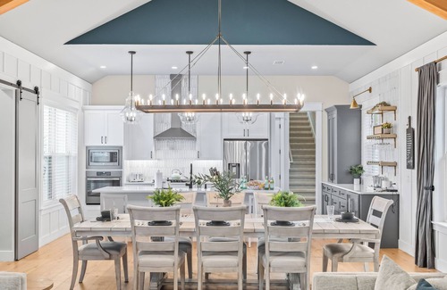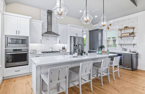 - A spacious island with seating and an elegant dining table