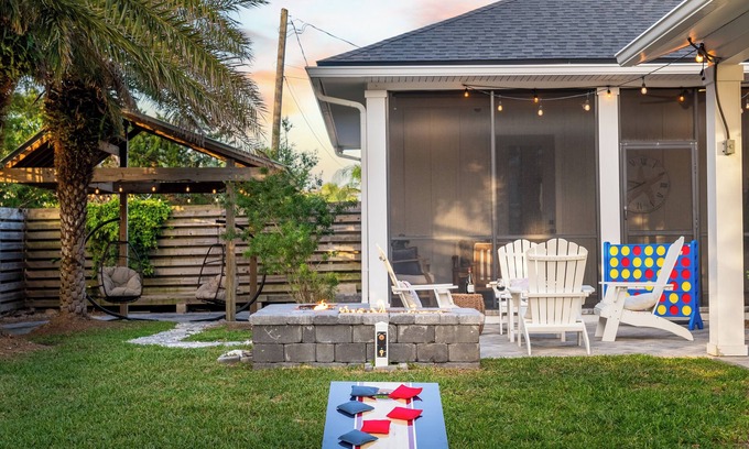 4 Min Walk to Beach~Golf Sim~Hot Tub~Private Backyard~Fire Pit~Outdoor Shower is located in Vilano Beach. 4 Min Walk to Beach~Golf Sim~Hot Tub~Private Backyard~Fire Pit~Outdoor Shower provides accommodation, featuring Parking, Security/Safety, Hot Tub, among other amenities. This House features Parking, Security/Safety, Hot Tub, to make your stay a comfortable one.