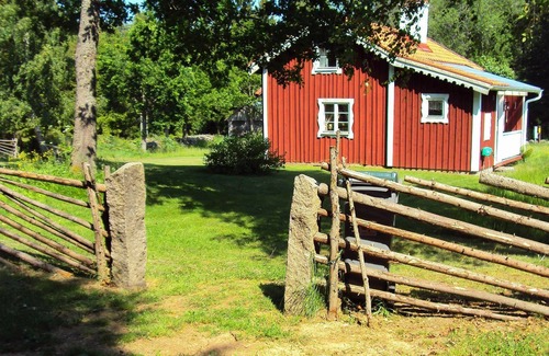 Cozy holiday home in a lovely setting. Perfect for a relaxing holiday, the house is close to beautiful nature with lots of trees and greenery. About 600 m to the beautiful Lake Kråksjön, and on the big nature lawn there is plenty of space for play and games. A “trinite” kitchen with hotplates, coffeemaker and microwave oven. The living room has a fireplace which provides a homely atmosphere. The house dates back to the 1900s and has its older charm preserved, the ceilings upstairs is 185 cm high, as it often was built in the past. Steep stairs to the upper floor. Outside in the garden there is a lovely patio, and here you may light up the grill on warm summer evenings.
