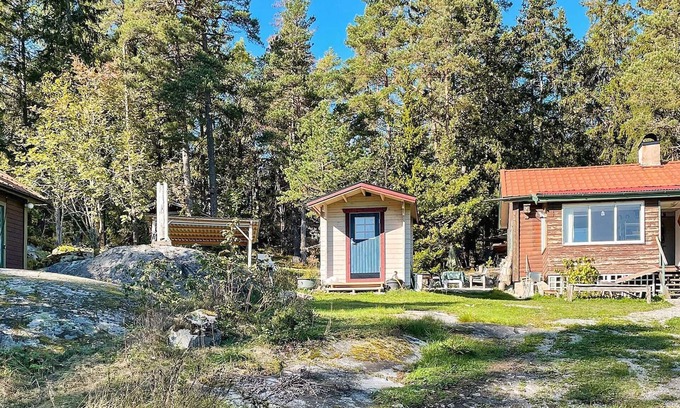 Welcome to a cozy and bohemian house on a hilly natural site on beautiful Vätö, an idyll with high cultural and historical value, a stonecutter's village and nice baths. The house is charmingly bohemian and during summer, spring and autumn you like to sit on the large cozy glassed-in balcony with sliding windows. Here you can enjoy the rural view and look out over the small lake. In the living room you sit comfortably on the pull-out sofa bed and feel free to light the fire on chilly evenings, firewood included. In the house there is a bedroom with a double bed and next to the bedroom there is a small bathroom with composting toilet and sink and washing machine. You can shower in the newly built shower house, which is located about 4 m from the house, and here there is also a composting toilet and sink. There is also an outdoor shed on the grounds. The kitchen has everything you need and you can stand and wash the dishes with the windows open to the beautiful view. If you light the wood stove in the kitchen, you will quickly get warm and cozy. On the plot, also about 4 m from the shower house, there is an annex with two beds, microwave, kettle and small dining area. In the storage room next door there is a larger fridge and freezer. Feel free to take a bath outdoors in the wood-fired hot tub and gaze out at the stars. There is also a sauna and outdoor shower here so you can create your own little spa. You have no neighbors nearby so you can feel free. Further down the plot there is a small culinary caravan from the 1970s that you also have access to. There are several patios on the grounds and feel free to use the gas grill (you need to buy gas yourself) for a good barbecue dinners. About 100 m below the house runs a road that is sparsely trafficked, but somewhat more so on weekends. From nearby Håknäsbrygga you can take a steamboat to Arholma and see Stockholm's beautiful archipelago. A short walk or bike ride takes you to the beautiful Håknäsbadet, where there is both a sandy beach, piers and a playground for children. Bathing areas are available almost everywhere on the island, including a lake with a jetty. The nearest grocery store is about 1.5 km from the house. If you want to eat well, you can cycle to the very nice restaurant Norrgärdet for a wonderful dining experience.