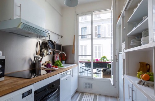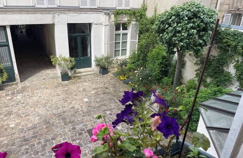 The kitchen with a lovely view on authentic paved Paris stones cour.
