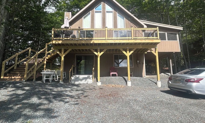 Enjoy your Pocono Mountain vacation in our beautiful lakeview chalet. With 2 main floor bedrooms, large lakeview loft bedroom, two full bathrooms, two decks, a screened in porch, and more, all that's missing is you!