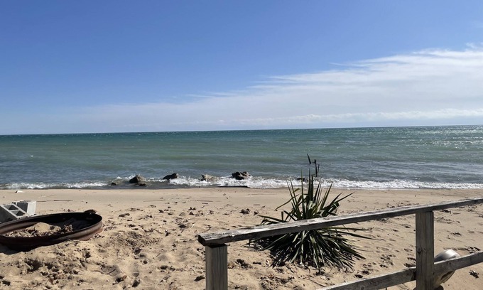 Studio Type Cabin with kitchenette right on the beach! Beautiful Lake Huron views with private grill and picnic table shared firepit and sandy bottom lakeshore. Sofa, refrigerator/freezer, stove, microwave, sink, coffee maker and toaster make staying in as much fun as going out. Unit is number 4 of 6 in a six unit resort. One bedroom, one bath studio kitchenette right on the beach, sunrise view from bed! This unit has one large bedroom with one bed in it. The couch is also in the same room that can pull out into a full size bed to accommodate two more to sleep but it is a tight squeeze. The kitchen is connected without a door as seen in the pictures. This unit is perfect for a couple or a small family and has everything you need for a weekend getaway or fun family vacation. Leave your cares at home and lull yourselves to sleep while listening to the crash of the Lake Huron waves from your bed in this charming rustic adorable room right on the beach! Not recommended for four adults, sleeps 3 comfortably.