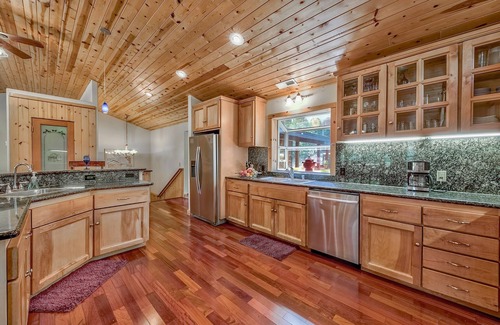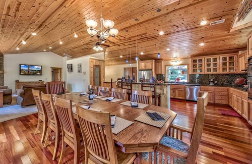 Relax, unwind and leave all your worries behind in this spacious 5-bedroon, 3,900 sq. ft. contemporary luxury cabin nestled in the pine forest with all the amenities you could ask for in a Tahoe retreat and more. Enter from the quiet street outside and find yourself in a massive great room with vaulted cedar ceilings custom designed for relaxing and entertaining with a fully appointed gourmet kitchen including an island cook-top / 4-person counter eating area, a dining area with dining table that seats up to 12 and a plush living area with a gas fireplace and 52' plasma HDTV with Bose home theater system and Blue-ray Disc player.