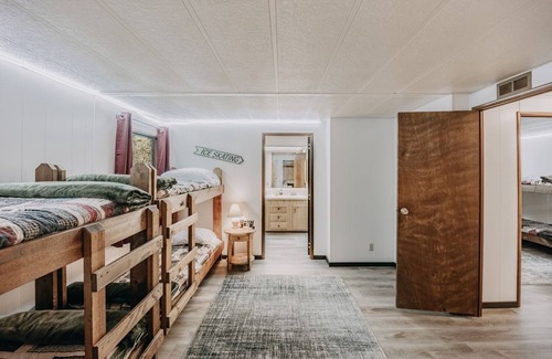 This single-story structure is packed with features, including central heating and air conditioning! As you step inside through the main entrance, you'll discover a generous-sized living area with a sectional couch and upholstered chairs, a flat-screen monitor, and a dining table with seating for eight. Next, you'll discover a well-thought-out kitchen, complete with a breakfast bar/prep station with two chairs, a coffee station/bar table with two stools, a built-in double oven, a glass top range, a dishwasher, and LOTS of counter space, plus an additional dining table with seating for five, and 1-full bath. In addition, there's one bedroom with 2-sets of standard-sized bunk beds and lots of closet space, a second bedroom with 1-full sized bed and 2-sets of standard-sized bunk beds plus an ensuite bath with dual sinks and a separate bathtub and shower. There's also a mudroom with an additional refrigerator, a full-size washer and dryer, and a door accessing a large covered deck complete with a private hot tub! The Ranch House will sleep up to 10 persons (maximum overnight occupancy).
