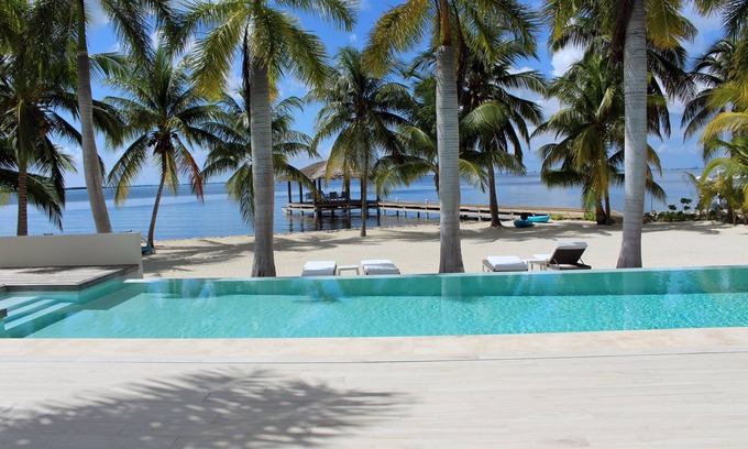 Number 43 is a large, contemporary, villa on a private white sand beach with a huge pool, large covered dock and crystal clear water.
