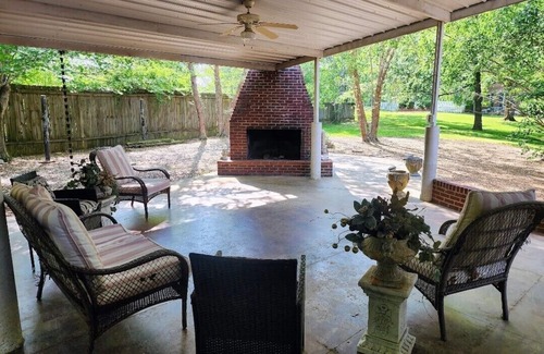 ● Covered back patio with brick fireplace and stained concrete
