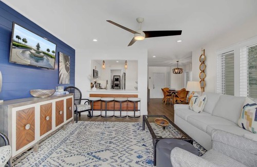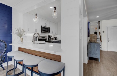 When it is time to retire for the day, this three-story townhome sleeps six guests and features two comfortable bedrooms, including a master bedroom with a king bed. The guest bedroom is unique in that it features a queen bed with a full bunk above. Each bedroom has an all new, completely renovated tile private bathroom. Finally, a large flat screen television is featured in each bedroom. The brand-new sofa in the living room includes a queen sleeper with a luxe mattress.