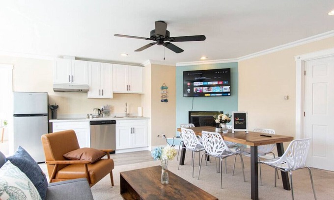 3BR 2BA unit B is on the second floor. It features 6 beds (3 queen beds, 2 full beds, 1 sofa bed). a newly renovated kitchen and living area.