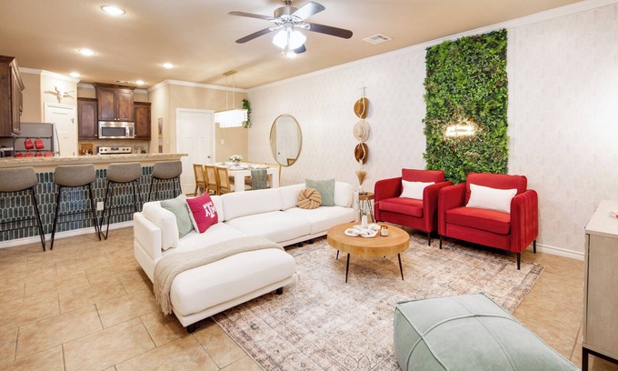 Enjoy a relaxing stay in our 4-bedroom home with plush bedding, just steps from local dining and a lively sports bar. Take advantage of on-site community amenities like a swimming pool and sand volleyball court, or unwind at the rooftop bar right in front of the property. Located only 3 miles from Kyle Field, you’re also within walking distance of a convenience store and plenty of restaurants, making it the perfect spot for exploring nearby attractions with ease!