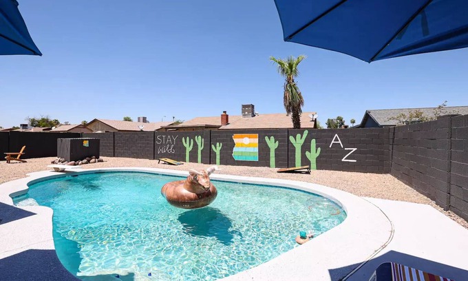 Ready for a fun and relaxing desert retreat? You are sure to make core memories while spending valuable time with friends and family! Our fabulous home contains everything you need for an enjoyable stay, including a beautiful diving pool, fire pit surrounded by cedar lounge chairs, and patio in the backyard complete with outdoor couches, loungers, and moveable umbrellas. Our home in Glendale is centrally located near many tourist attractions, hiking trails and highly sought after restaurants.