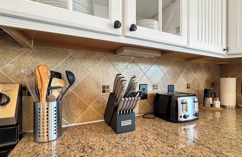 Step into the heart of the home, where the open floor plan kitchen, dining, and living areas are all thoughtfully designed for family togetherness. The fully equipped kitchen has everything you need, including a blender, crockpot, air fryer, coffee maker, and a coffee bar with a French press, drip coffee or Keurig to craft your perfect morning latte. Gather around the spacious dining table that seats 8–10, or opt for al fresco dining on the deck. After meals, relax on the plush L-shaped sofa, play a lively game of Pictionary, or simply enjoy quality time together. This level also includes a full-sized laundry room and a playful bunk bedroom, perfect for kids.