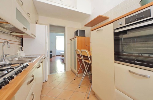 Kitchen : Fully equipped with utensils, MOKA, toaster, microwave, kettle, gas stove, refrigerator with freezer, oven, and dishwasher. It has a small table with stools, perfect for breakfast or a chat while cooking.