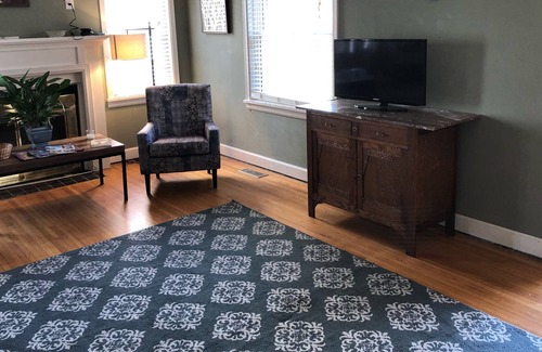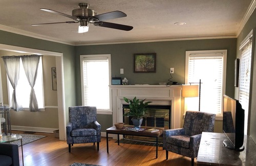 Our home is located on a quiet residential street in the southwest part of Bartlesville near the high school at 20th & Osage Ave just off Hillcrest Dr. It is a beautifully remodeled 1920s brick home with original wood floors and many quaint features. The house has four bedrooms with master and 2nd bedroom downstairs and two smaller bedrooms upstairs. The bathroom is spacious with tub and shower. Includes large living room, dining room, kitchen and laundry room with fenced backyard and detached garage. Fully furnished including linens, kitchen cookware and utensils, and appliances (refrigerator, dishwasher, stove cooktop and oven, coffee maker, microwave, and washer & dryer). We provide wifi along with flat screen TV with Roku streaming device for NetFlix and Sling TV. Sleeps 4-6.