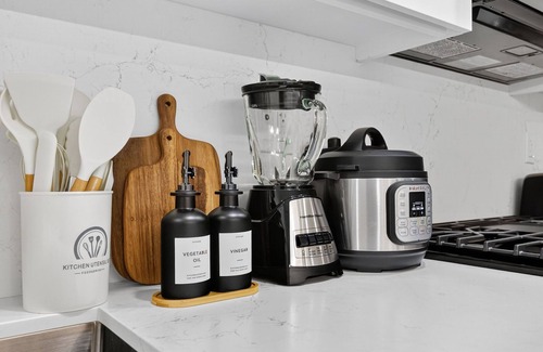 - Fully equipped kitchen with pots/pans, toaster, microwave, oven, coffee machine, coffee, kitchen knives, bakeware, dinnerware, coffee mugs, wine glasses, cooking utensils, kettle, tea, basic condiments, and more!
