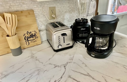Fully stocked kitchen with new appliances- stainless steel fridge, oven, dishwasher, coffee maker, microwave. Includes plates, cups, glasses, coffee, spices, and many kitchen tools for your cooking and bbqing pleasure.