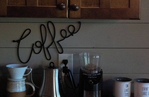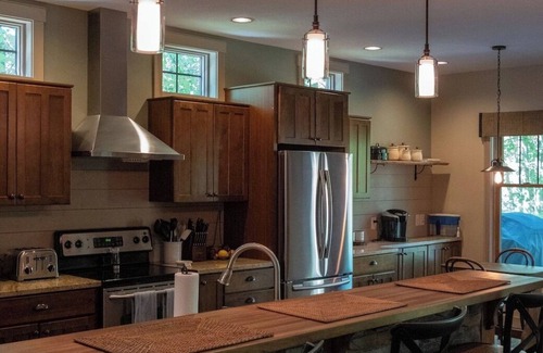 One of the many highlights of the property – fully stocked with all of the amenities to cook, host, and enjoy your stay – located adjacent to the open concept Great Room. The kitchen has plenty of storage space and a spacious Amish-built pie pantry / cabinet with pullout drawers to keep all your snacks and food supplies organized during your stay. Some specialty items included are: conical burr coffee grinder, kettle and Kalita Wave 185 pour over for coffee lovers, Keurig for a quick cup of coffee, or a regular drip coffee pot with insulated thermos. 8 quart Instant Pot, a powerful blender for smoothies and margaritas, plenty of bakeware such as cookie sheets, pie pans, and casserole dishes, mixing bowls and silicone mats, full non-stick ceramic cookware, and a large steamer pot for corn-on-the-cob or steamed artichokes. The dining room has a six-person dining table, and the kitchen has three elevated bar stools along with a kitchen nook with a small table and two chairs, perfect for a quiet breakfast or for young children to eat at. The property also has a premium natural gas grill.