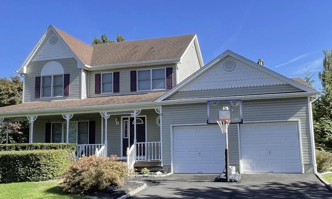 The front of the house has a covered porch with two adirondack chairs, and the driveway has a basketball hoop perfect for kids (or adults). Basketball and other miscellaneous sports equipment is available for guest use in the garage.