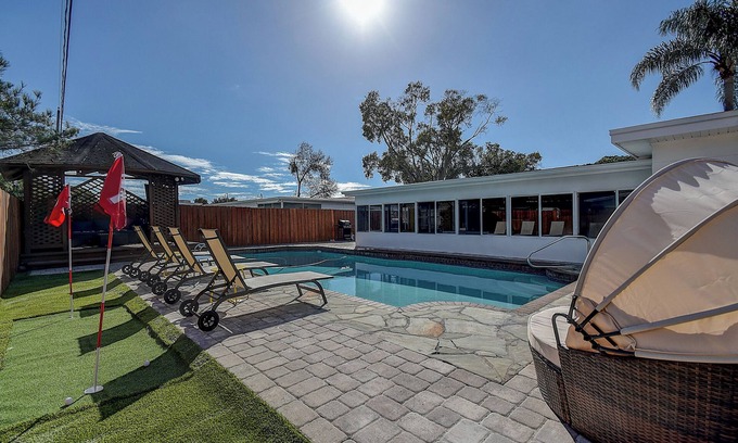 This modern 4-bedroom home, just minutes from Tampa’s top attractions, offers supreme amenities for relaxation and fun. Enjoy the heated private pool, putting green, and screened patio with a 70-inch TV. Accommodating up to 16 guests on 8 beds, the home features 2 bathrooms, a fully equipped kitchen, and multiple living areas. With a lanai and gazebo, it’s perfect for unforgettable gatherings. Top attractions like Busch Gardens and Raymond James Stadium are just a short drive away.