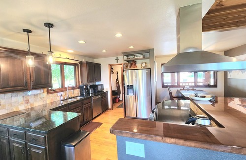 This large family friendly home sits on 5 private & quiet acres with amazing mountain views. This home can accommodate families with 5 bedrooms (3 king & 2 queen/twin) & mediaroom with 4 single beds (all have TV's). Two living spaces: *Main level: 3 bedrooms, 2 baths, kitchen, 2 dining areas & living room with a gas fireplace.