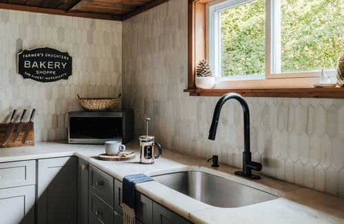 After a meal, unwind in the stylish and comfortable living room, featuring a large sofa and a smart TV with WiFi, cable, and Netflix. Enjoy board games with friends, find a quiet moment with a book from our library in one of the cozy reading nooks, or spin some tunes on the vinyl player. The oversized window seat offers a perfect spot to relax and enjoy the view. If you decide to catch some Zzz's, our large sofa converts into a bed that sleeps two.
