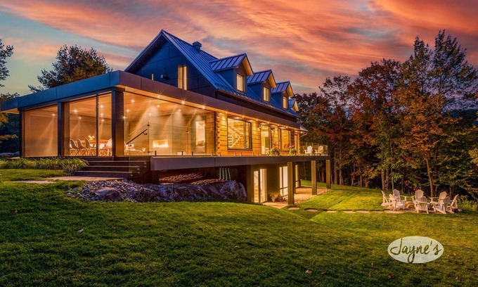 RENEW - The owners created this architectural gem with the theme "natural" in mind - using all real quality elements of wood and metal bringing new life into natural materials, hence its name "Renew." The cottage is remnants of a timber log structure mixed with architectural metal panels. Clad in large windows and decking, focusing on bringing the outside in, this really is the perfect place to enjoy your natural surroundings. The main level of the cottage opens up to a large wrap-around deck/covered porch and Muskoka Room which has automatic screens that can lower and seal the area from mosquitos. From the lower level media room with a 150' projector screen and Dolby Atmos 7.2 surround sound, walk out to the large grassy lawn with a firepit and Muskoka chair seating for 8. A boardwalk brings you down to the waterfront where there is a large 20x24 dock with seating and wifi connection! Beautiful swimming conditions with a 6' depth at the dock and just a quick swim to the 15' water trampoline! Another amazing feature of the property is the olympic-sized beach volleyball court with beach seating for spectators. This 15 acre property offers lots of private open land and meadows to discover, play & relax!