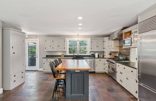 A sense of privacy and adventure awaits guests as they drive down this private road to Wildflower Retreat, surrounded by 40 plus acres of land, but located just about a mile from Parsons Beach and a short drive to Dock Square, Gooch's Beach and Mothers Beach. Enjoy the oversized in-ground pool, manicured perennial gardens and peaceful outdoor setting from dawn to dusk. The beautiful outdoor space includes a awning, propane fire table, Weber grill, lounge chairs, dining table, fire pit area, and beautiful deck and patio. The home is outfitted with features such as a Viking professional range, Subzero refrigerator, smart TVs, and home gym with a Stairmaster and wall-mounted barre.
