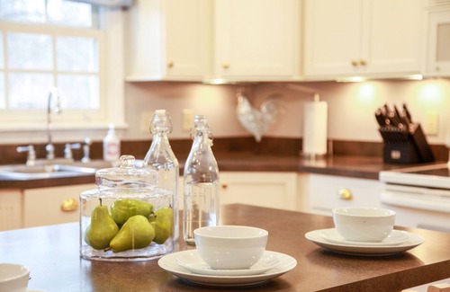 In the living room enjoy a bright and open living space with smart TV over the fireplace. Walk-out French doors provide access to the back deck and patio. A large collection of movies is offered to enjoy movie night. Bluetooth sound bar allows you to pair and play music. There is also a selection of board games and cards for game time. Have some quiet time and cozy up in one of the window nooks and take in a book.