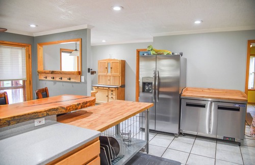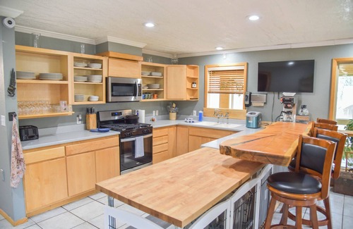 Up the spiral staircase you will come to another large sunroom full of life that will lead you into the kitchen, complete with stainless steel appliances including dishwasher, gas stove/oven, microwave, two refrigerators, and a freezer! Kitchen has plenty of counter space for meal prep, pantry, cabinets, and butcher block counters! Off the kitchen you will find another Queen bedroom, formal laundry room with a washer/dryer, wash tub area, built-in ironing board, pantry shelving etc you will also find the upstairs guest bathroom with a shower/tub combo, sink, vanity and throne. Onward to the dining area and living room you will find large windows that let you bask in all the natural light, a queen sleeper sofa, flat screen tv and electric fireplace (coming soon). Through the living room leads to the Master Bedroom suite housing a king sized bed, curved TV, and private bathroom featuring a shower, bath tub, throne room, oversized closet, his/her sinks and vanities/mirrors.