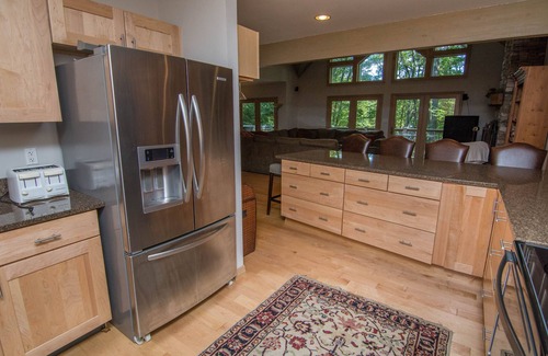 Five Bedroom house with 3 1/2 baths overlooking the cove, dock, and enjoy the babbling brook next to the home. Full service kitchen, large deck overlooking the lake with hot tub, and grill. First floor master bedroom with ensuite bath, upstairs, two queen bedrooms with one jack/ jill bath and one queen and one full bedroom with shared hall bath. Billiard room right off the main living area with additional seating area as well. Open concept for dining, kitchen, and living room area. Laundry room and half bath close to open areas, and close to the deck and hot tub.