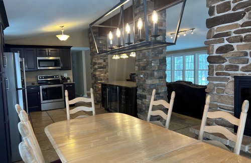 All Newly Remodeled Full Kitchen, dining room, living room in 2012. Dark Cherry Cabinets with Quartz Countertops, new stainless steel appliances including a under-countertop beverage center in the large island. The large quartz island fits into the beautiful hand craft stone pillars that are in the center of the room. The kitchen can comfortably seat 12. The open concept and vaulted ceiling combines to the large 40 foot long living room with views from all angles in the 2 sliding glass doors to the large deck customized deck and the spectacular rows of ceiling to floor new white trim windows. The windows wrap around the entire large space to allow cool breezes, amazing views and sounds of the loons.