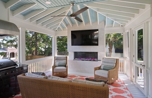 The crisp and modern kitchen is well stocked and has professional appliances. Living and dining sliding glass doors open to an incredible covered porch with an outdoor fireplace and kitchen. The back porches have comfortable furniture to enjoy the ocean breezes and stars.