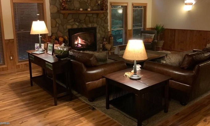 Need a memorable family escape, in a luxury community? 5300 sqft, impeccably maintained, 2.5 wooded acres, 5 bedrooms / 8 beds, 2 private decks, firepit, water feature, screened-in porch, game room, home theatre! Go kayaking, canoeing, swimming, and fishing at the coveted Lake Wallenpaupack or Wallenpaupack beach! Located ONLY a few blocks away! Kayak/Canoe/fishing rods available for rent. Close to local water park and ski resorts. Start your adventure now!