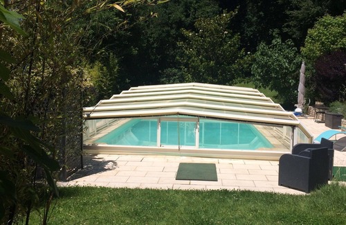 Large pool of 5.5m / 10.5m secured with a telescopic shelter, outdoor shower. Large pond with carp and goldfish, secured by fence.
