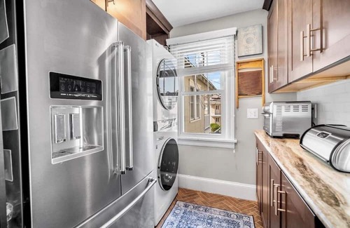 Inside authentic coastal charm and character await, complimented by modern luxuries. A well-appointed living room with a smart TV, cozy sectional couch with pull out sofa bed and swivel chair welcome your family to relax together. An open floor plan reveals the large dining room featuring a beautiful gas fireplace. Continue to the newly renovated and fully stocked kitchen with top of the line appliances, complete with a washer and dryer and plenty of storage for laundering. This level also showcases 3 private bedrooms, each with a QUEEN sized bed, chest of drawers, nightstand and closet. A full bathroom with a shower/tub combo off the hallway completes this level of living space.