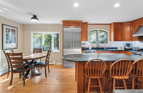 We purchased this home in February 2016 and completely re-furnished and decorated in a rustic cabin vibe (including our 5' 5" chainsaw bear that greets you when you walk in). We have rented homes with large groups many times in the Killington area and took everything we had learned from those experiences when designing and furnishing this home. We very often use this home ourselves, and our main goal is having a comfortable and fun stay for everyone in the group by making sure there are enough beds, seating and space for each guest. This large home boasts 5 bedrooms and 3 1/2 bathrooms, currently sleeping 12 with new regulations with multiple configuration options. The full hallway bathroom upstairs was renovated in 2022 and the master bathroom in 2024. This home also offers a dining room which has enough seating for the whole group and friends! No need for eating dinner in shifts or in separate areas - everyone can enjoy a meal at the end of the day together by the fireplace.