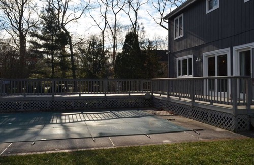 The outdoor space includes an inground pool with large deck surrounding. On the deck we have patio furniture for sunbathing, a large teak table with chairs that seats 10 or more and a new large grill. There is also a large open lawn for summer games/fun.