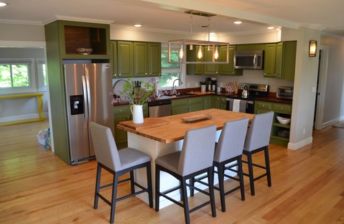 Open kitchen with stainless steel appliances, butcher block counters, handcrafted cabinetry, and large island opens up to the natural lighting of the sun-filled living room with fireplace. Five bedrooms with 1 king, 2 queens and 4 single beds sleeps up to 10 people. Sunroom can be used as an office. Hardwood floors throughout. Tiled bathrooms. Nearby parks, marinas, boat launch, shopping and only a short drive to Burlington or Stowe. Visit Ben & Jerry's, local breweries, and more!