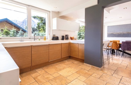 Sa salle de billard attenante à un grand salon convivial avec cheminée, ouvert sur l'espace repas et sur la cuisine, moderne ultra équipée, donnant sur la terrasse et le jardin, dans laquelle vous prendrez plaisir à cuisiner en contemplant la Muzelle.