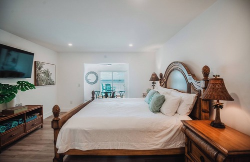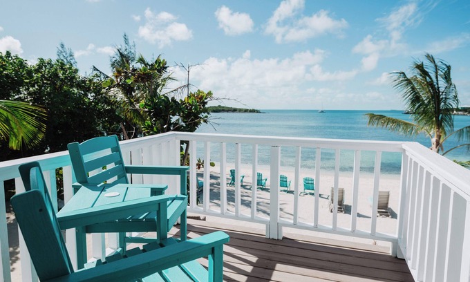 Guana Beach Inn - A quaint 8 room Inn in the heart of Great Guana Cay - located directly on the sand at the Sunset Beach (Sea of Abaco) next to Grabbers Bar and Restaurant. This place is famous for its incredible sunsets! Each unit at the Inn has direct ocean views! Each unit is slightly different in size and setup and each unit has its unique decor and are individually named with a reference from the area. The bottom floor offers 4 suites with either king or queen size beds and with or without sleeper sofas. You will also find a patio in front of each of these units with seating overlooking the beach and ocean. The 4 top floor units are accessed by 1 flight of stairs and an exterior walkway. These units are slightly larger than the bottom units and offer balconies with individual seating. Here you will find all king-size beds and sleeper sofa. All units at the Guana Beach Inn provide private bathrooms with showers, free Wi-Fi, Mini Fridge, Microwave, Keurig Coffee maker, split ac units and room darkening blinds. The Inn also has its own backup Generator.