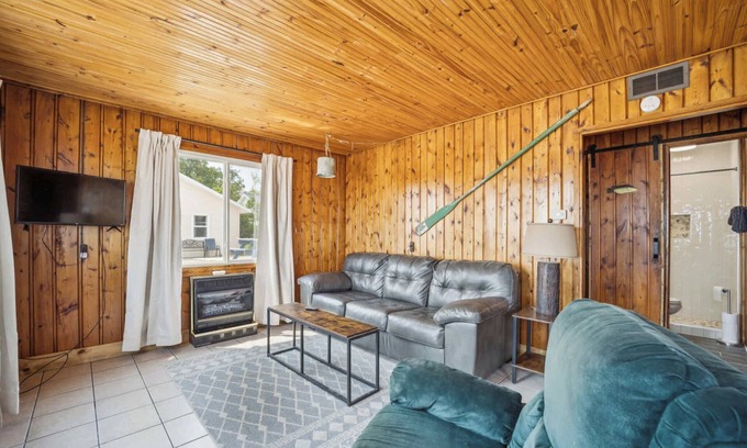 It’s a 2-bedroom, 1-bath cabin, and the bathroom is brand-new—fully renovated with fresh tile, updated fixtures, and a much more spacious shower. Add in new mattresses, pine-paneled walls, and those huge windows, and you’ve got the best seat in the house for your unplugged lakefront getaway.