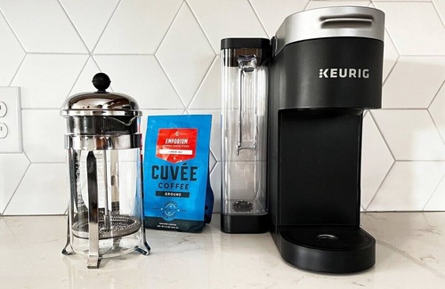* Modern and well-equipped kitchen with a French Press, Keurig Coffee Machine