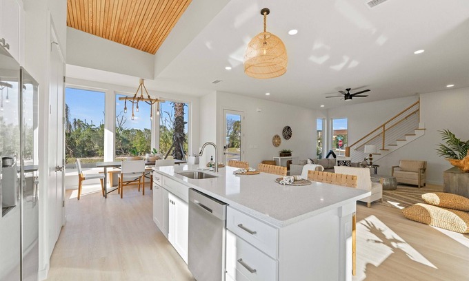 Modern beach retreat just 5 minutes from the sand! This beautifully designed Palm Coast home features a gourmet kitchen, open-concept living, an outdoor shower, sunlit office, ping pong, and a serene patio. Perfect for families, remote work, or group getaways. Walk to the beach, unwind in luxury, and enjoy optional concierge services like golf cart rental. Experience the best of coastal Florida living!