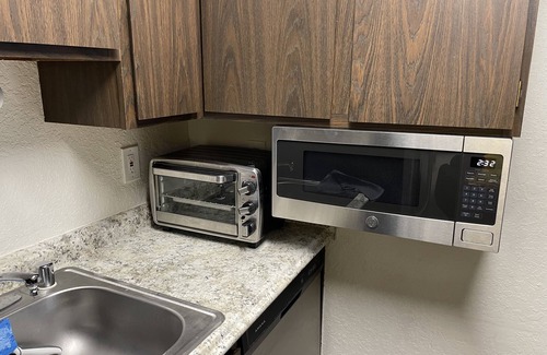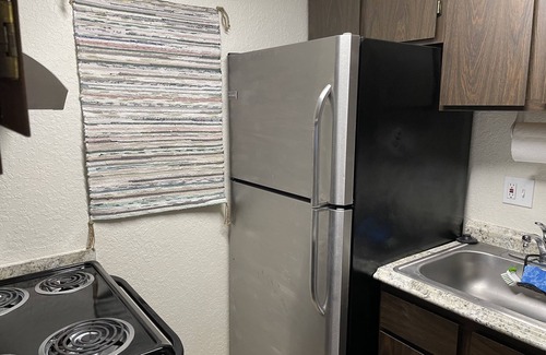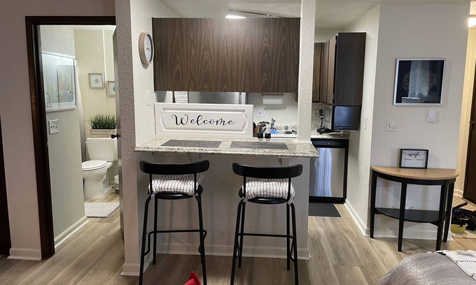 Sitting on the couch, I am surrounded by warm colors in a cozy studio in a contemporary setting. The fireplace has lighted candles, and the TV is the perfect size. Easy access to wi-fi and cable allows my phone and computing accessories to be connected. The galley kitchen is perfect for cooks with a bar for eating meals. Easy access for non-cooks to local restaurants and pubs. Walking trail along the river and nearby parks. Blackout curtains are a must for the traveler and plenty of closet space.