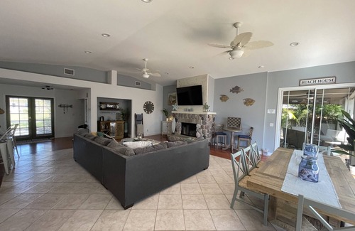 At the end of the day, you'll have plenty of space inside to enjoy with your family and friends. The home has 2900 sq. feet of in-door space with a large open living room, where everyone can be. Plenty of towels, linens, fully equipped kitchen, pool towels, washer and dryer. There is plenty of space outside as well, with a very large deck with pool, covered dinette area and enough room to hang out and relax enjoying the florida sun. There are loungers and an outdoor sectional with plenty of seating. The backyard has several plants and trees giving you the feel of a true Florida home.