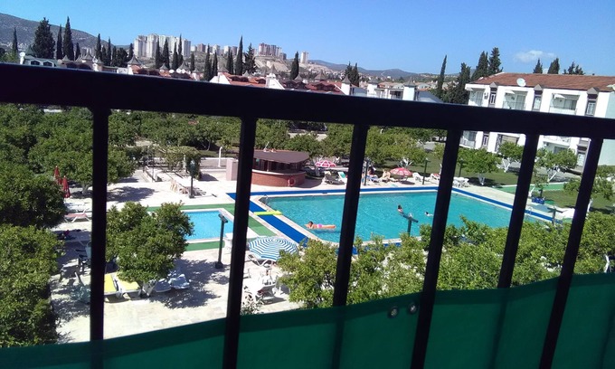 800 meters from the sea, 1 + 1 fully furnished apartment with pool. In our flat with 100 tangerines and orange trees in its garden, you can both have fun by the pool and you can walk to the beach. There is the city's largest shopping Mall within 1 km. 1 bedroom and 1 bathromm , with air conditioned, 55 inch lcd tv, large refrigerator, one double bed, two single beds,Table for 4 people, stove, hot water for 24 hours,site security officer and more.