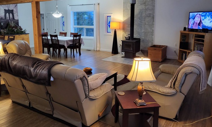This listing is not affected by new B&B rules. This is truly one of kind. It is 4 bedrooms on 5 acres sleeps 8 comfortably all yours to watch deer, moose and the occasional bear. Put your feet up by the woodstove and watch your favorite show on our 55" tv. Wireless wifi as well as TV in both master bedrooms. Fully stocked kitchen so great for longstays. Can accomodate very large trucks for work crews. This has been completely renovated this summer so it's spotless with a new propane furnace. All of the appliances are new including Bosch dishwasher. The living room/dining room is a huge open space so great for kids to run around. Across the street from the Balmoral Hiking trail which will lead you all the way to either eagle Bay or white lake which is a renowned lake for trout fishing. Also 5 minutes away from Shuswap Lake so bring your boat, horses, atv or dirt bike. Work crews are welcome.